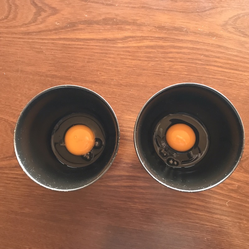 1ヶ月たまごは白身の粘性が低いためなのか、黄身が重力によって押し潰されてる感じです。